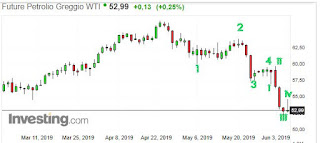 Il petrolio, grazie alle tensioni con l'Iran è in forte recupero ed ha superato il primo target indicato a 55.8, vedrei la zona 59/60 dove sono presenti numerose resistenza, come il test fondamentale per stabilire se si tratta di un rimbalzo o di una ripresa del rialzo.