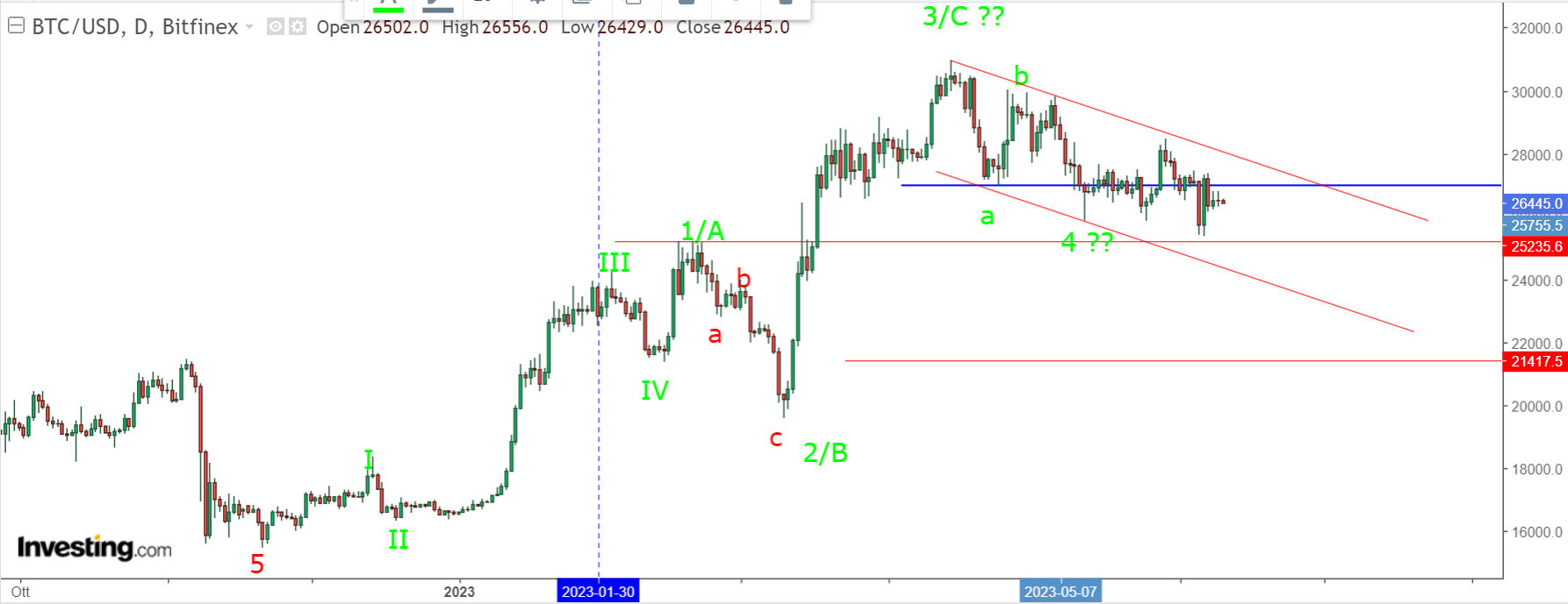 Un'occhiata a quella cosa strana che chiamano Bitcoin, che tempo addietro soleva anticipare l'azionario, come segnale risk on/off. Anch'esso fermo da alcune settimane, ma è già andato sotto il target ideale di un'ipotetica 4 e sembra anche aver rotto un triangolo verso il basso, anche se per ora esita, la rottura dei 25K dovrebbe portare almeno a 21,5K.